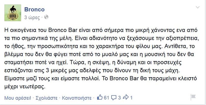 «H οικογένεια του Bronco Bar είναι από σήμερα πιο μικρή χάνοντας ένα από τα πιο σημαντικά της μέλη. Είναι αδιανότητο να ξεχάσουμε την αξιοπρέπεια, το ήθος, την προσωπικότητα και το χαρακτήρα του φίλου μας. Αντίθετα, το βλέμμα του δεν θα φύγει ποτέ από το μυαλό μας και η μουσική του δεν θα σταματήσει ποτέ να ηχεί. Τώρα, η σκέψη, η δύναμη και οι προσευχές εστιάζονται στις 3 μικρές μας αδελφές που δίνουν τη δική τους μάχη. Είμαστε μαζί τους και είμαστε πολλοί. Το Bronco Bar θα παραμείνει κλειστό μέχρι νεωτέρας».